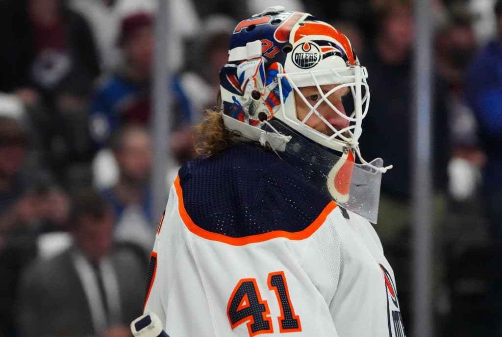 Jun 2, 2022; Denver, Colorado, USA; Edmonton Oilers goaltender Mike Smith (41) before the game against the Colorado Avalanche in game two of the Western Conference Final of the 2022 Stanley Cup Playoffs at Ball Arena. Mandatory Credit: Ron Chenoy-USA TODAY Sports