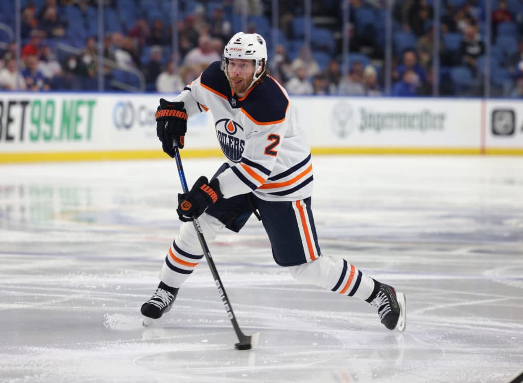 Nov 12, 2021; Buffalo, New York, USA; Edmonton Oilers defenseman Duncan Keith (2) takes a shot on goal during the first period against the Buffalo Sabres at KeyBank Center. Mandatory Credit: Timothy T. Ludwig-USA TODAY Sports