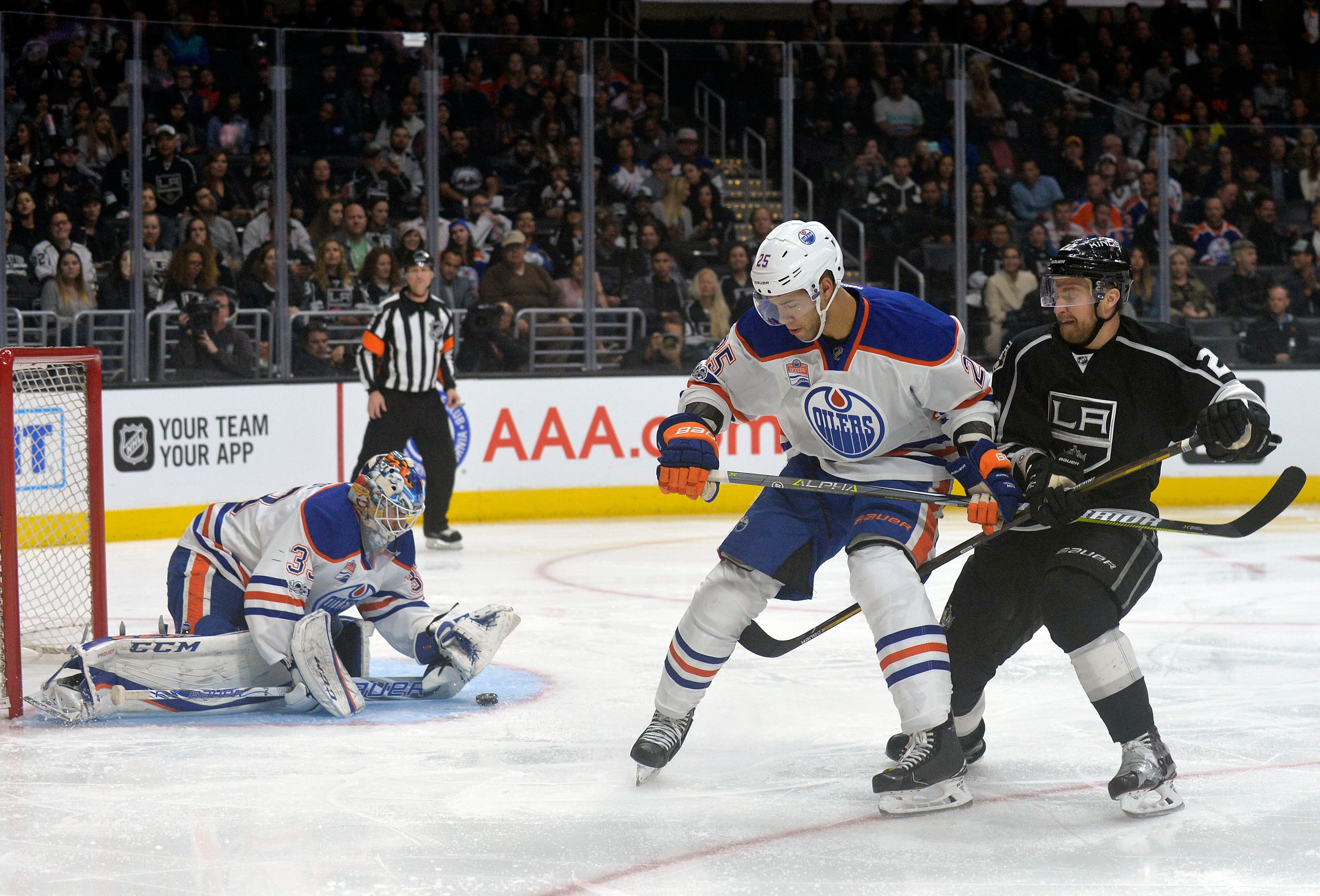 April 4, 2017; Los Angeles, CA, USA; Edmonton Oilers goalie Cam Talbot (33) covers the puck as defenseman Darnell Nurse (25) blocks Los Angeles Kings center Trevor Lewis (22) during the second period at Staples Center. Mandatory Credit: Gary A. Vasquez-USA TODAY Sports