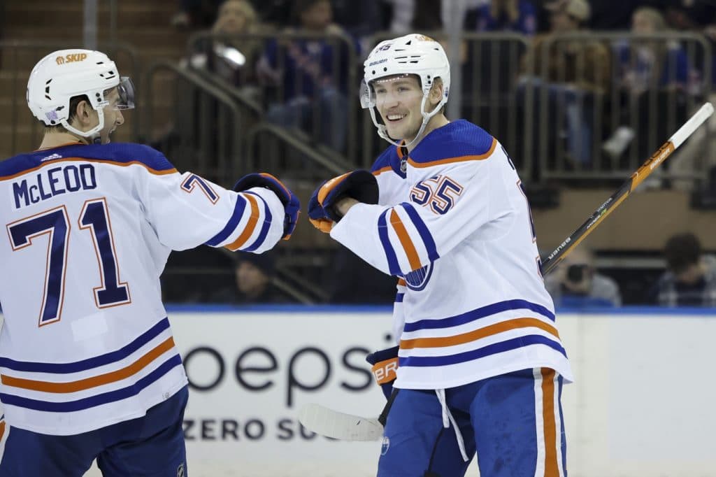 Nov 26, 2022; New York, New York, USA; Edmonton Oilers left wing Dylan Holloway (55) celebrates with Edmonton Oilers center Ryan McLeod (71) after Holloway’s goal against the Edmonton Oilers during the third period at Madison Square Garden. Mandatory Credit: Jessica Alcheh-USA TODAY Sports