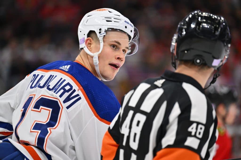 Nov 30, 2022; Chicago, Illinois, USA; Edmonton Oilers forward Jesse Puljujarvi (13) talks with referee Beau Halkidis (48) during the second period of a game against the Chicago Blackhawks at United Center. Mandatory Credit: Jamie Sabau-USA TODAY Sports