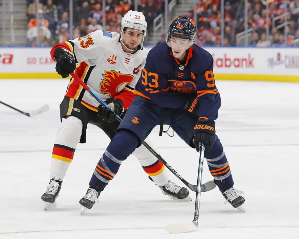 Dec 27, 2019; Edmonton, Alberta, CAN; Calgary Flames forward Sean Monahan (23) defends Edmonton Oilers forward Ryan Nugent-Hopkins (93) during the third period at Rogers Place. Mandatory Credit: Perry Nelson-USA TODAY Sports