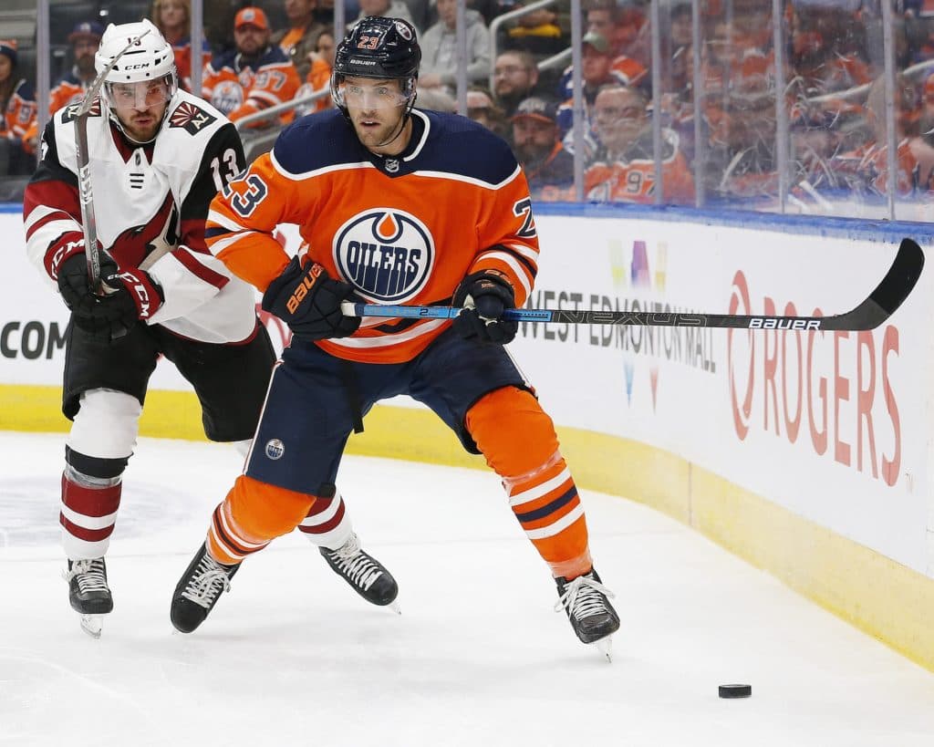 Sep 24, 2019; Edmonton, Alberta, CAN; Edmonton Oilers forward Riley Sheahan (23) protects the puck from Arizona Coyotes forward Vinnie Hinostroza (13) during the first period at Rogers Place. Mandatory Credit: Perry Nelson-USA TODAY Sports