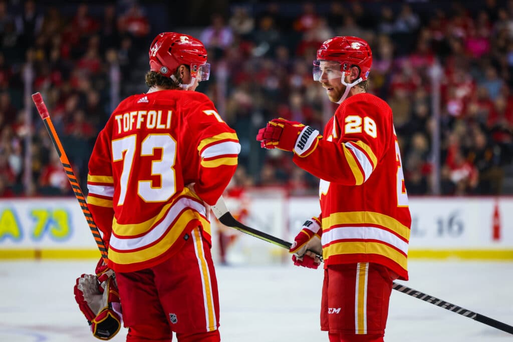 Mar 28, 2023; Calgary, Alberta, CAN; Calgary Flames center Elias Lindholm (28) and right wing Tyler Toffoli (73) waiting as a play under the video review during the second period against the Los Angeles Kings at Scotiabank Saddledome. Mandatory Credit: Sergei Belski-USA TODAY Sports