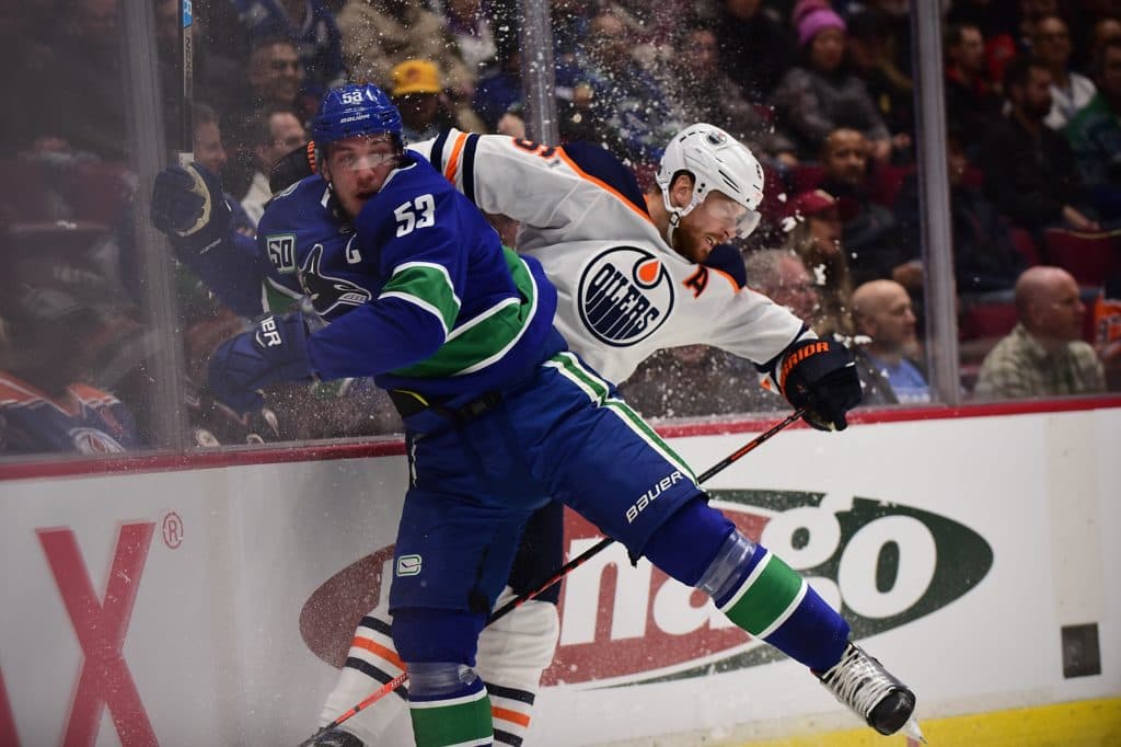 Dec 1, 2019; Vancouver, British Columbia, CAN; Vancouver Canucks forward Bo Horvat (53) checks Edmonton Oilers defenseman Adam Larsson (6) during the first period at Rogers Arena.