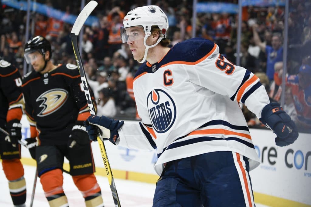 Nov 10, 2019; Anaheim, CA, USA; Edmonton Oilers center Connor McDavid (97) celebrates after scoring a goal during the first period against the Anaheim Ducks at Honda Center.