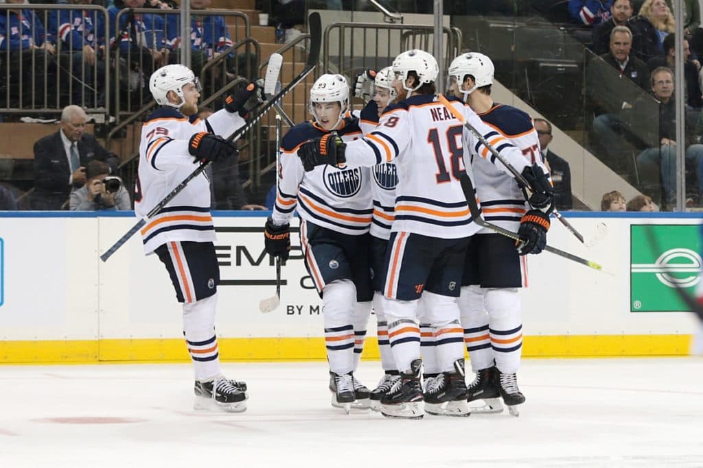 Oct 12, 2019; New York, NY, USA; Edmonton Oilers center Leon Draisaitl (29) celebrates his goal with teammates during the third period against the New York Rangers at Madison Square Garden. Mandatory Credit: Vincent Carchietta-USA TODAY Sports