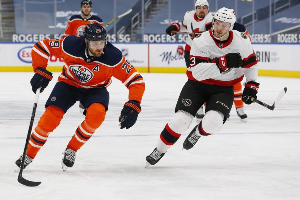 Mar 12, 2021; Edmonton, Alberta, CAN; Edmonton Oilers forward Leon Draisaitl (29) carries the puck around Ottawa Senators defensemen Josh Brown (3) during the first period at Rogers Place. Mandatory Credit: Perry Nelson-USA TODAY Sports