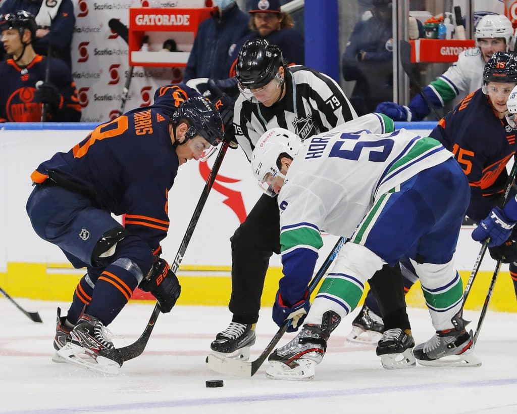 Jan 13, 2021; Edmonton, Alberta, CAN; Edmonton Oilers forward Kyle Turris (8) and Vancouver Canucks forward Bo Horvat (53) take a face-off during the third period at Rogers Place. Mandatory Credit: Perry Nelson-USA TODAY Sports