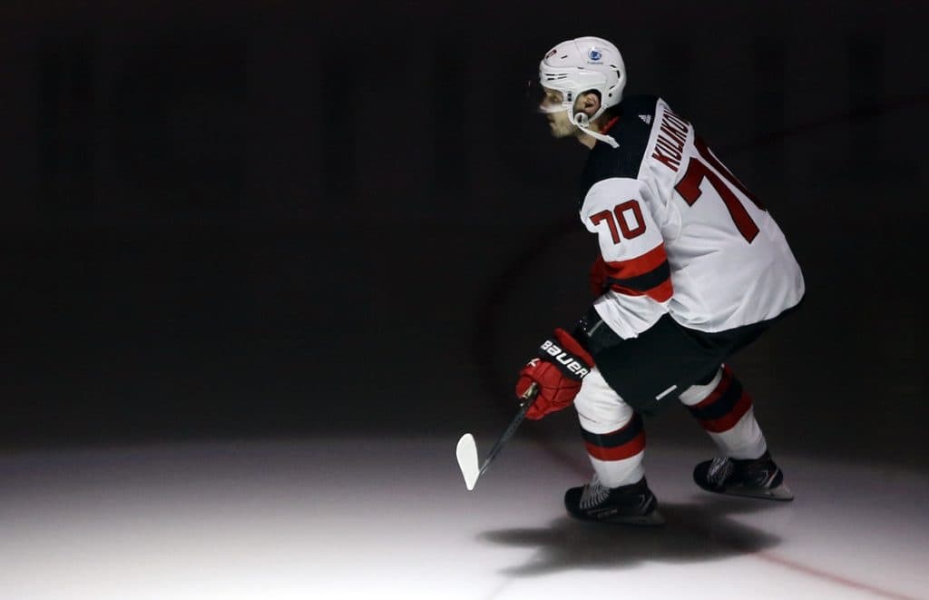 Mar 21, 2021; Pittsburgh, Pennsylvania, USA; New Jersey Devils defenseman Dmitry Kulikov (70) takes the ice to play the Pittsburgh Penguins at PPG Paints Arena. New Jersey won 2-1 in overtime. Mandatory Credit: Charles LeClaire-USA TODAY Sports