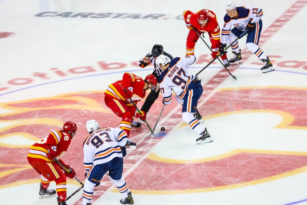 Feb 19, 2021; Calgary, Alberta, CAN; Calgary Flames center Mikael Backlund (11) and Edmonton Oilers center Connor McDavid (97) faces off for the puck during the second period at Scotiabank Saddledome. Mandatory Credit: Sergei Belski-USA TODAY Sports