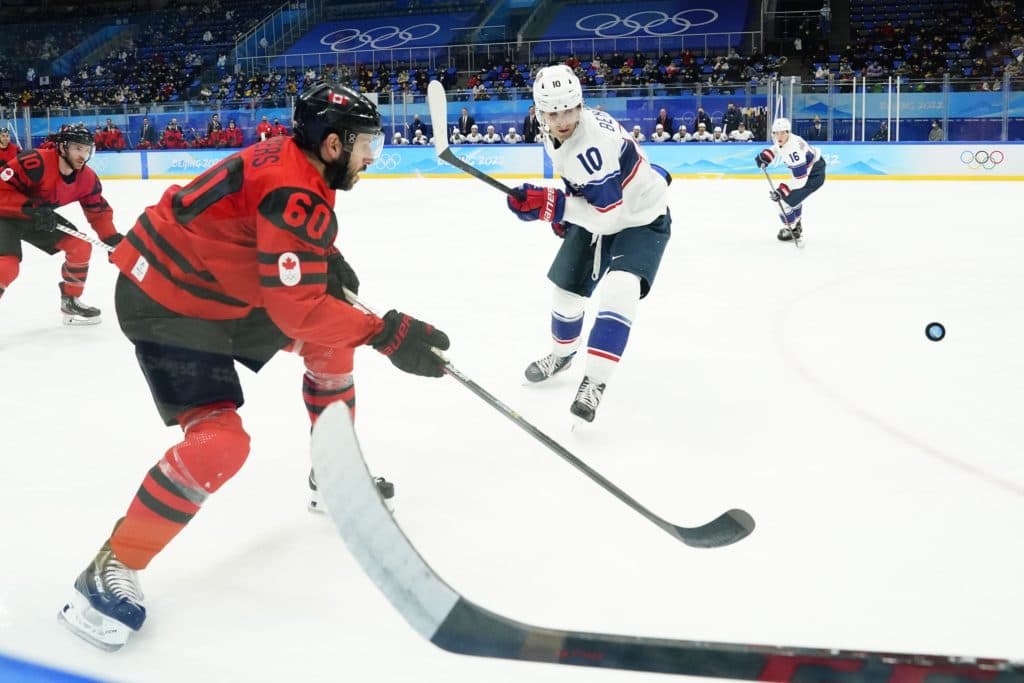 Feb 12, 2022; Beijing, China; Team Canada defender Jason Demers (60) and Team USA forward Matty Beniers (10) during the third period in the men’s ice hockey preliminary round of the Beijing 2022 Olympic Winter Games at National Indoor Stadium. Mandatory Credit: Rob Schumacher-USA TODAY Sports