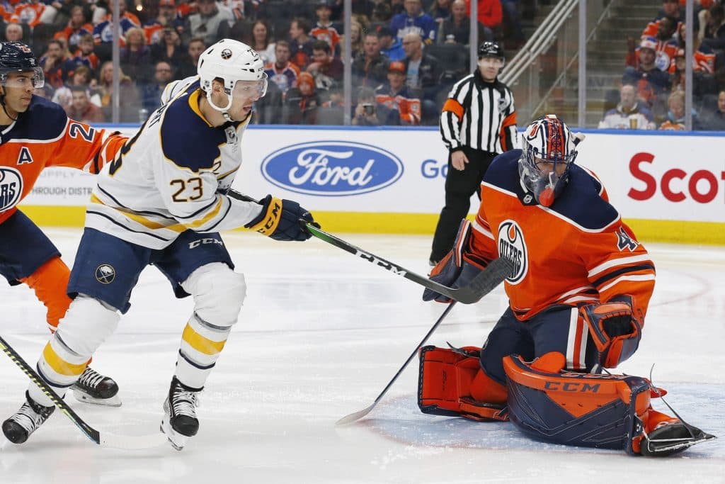 Dec 8, 2019; Edmonton, Alberta, CAN; Buffalo Sabres forward Sam Reinhaert (23) looks for a rebound in front of Edmonton Oilers goaltender Mike Smith (41) during the second period at Rogers Place. Mandatory Credit: Perry Nelson-USA TODAY Sports