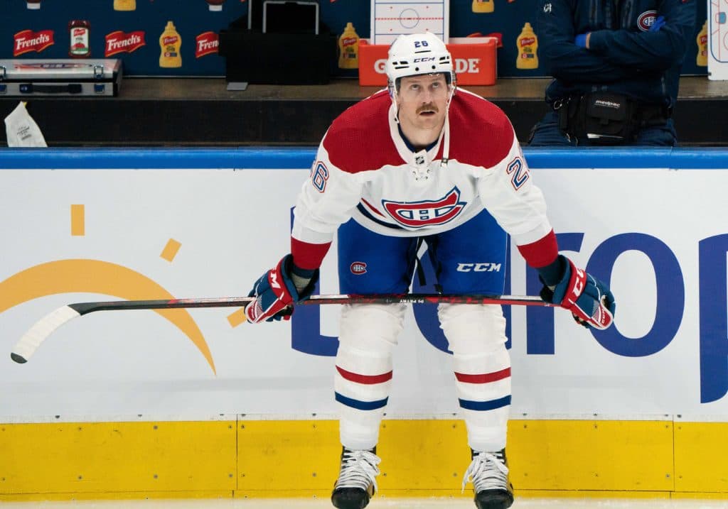 May 22, 2021; Toronto, Ontario, CAN; Montreal Canadiens defenseman Jeff Petry (26) takes a break during the warm-up in game 2 of the first round of the 2021 Stanley Cup Playoff against the Toronto Maple Leafs at Scotiabank Arena. Mandatory Credit: Nick Turchiaro-USA TODAY Sports