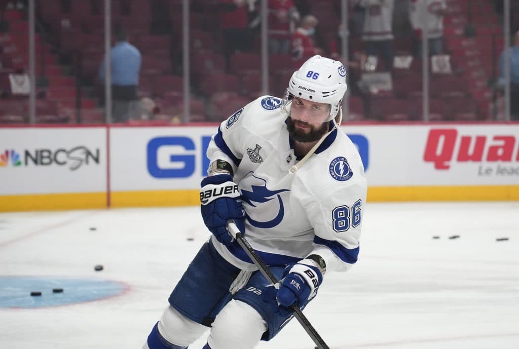 Jul 2, 2021; Montreal, Quebec, CAN; Tampa Bay Lightning right wing Nikita Kucherov (86) skates during the warmup period in game three of the 2021 Stanley Cup Final against the Montreal Canadiens at the Bell Centre. Mandatory Credit: Eric Bolte-USA TODAY Sports