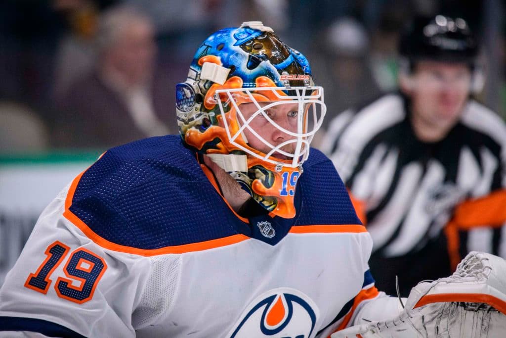 Mar 3, 2020; Dallas, Texas, USA; Edmonton Oilers goaltender Mikko Koskinen (19) in action during the game between the Stars and the Oilers at the American Airlines Center. Mandatory Credit: Jerome Miron-USA TODAY Sports