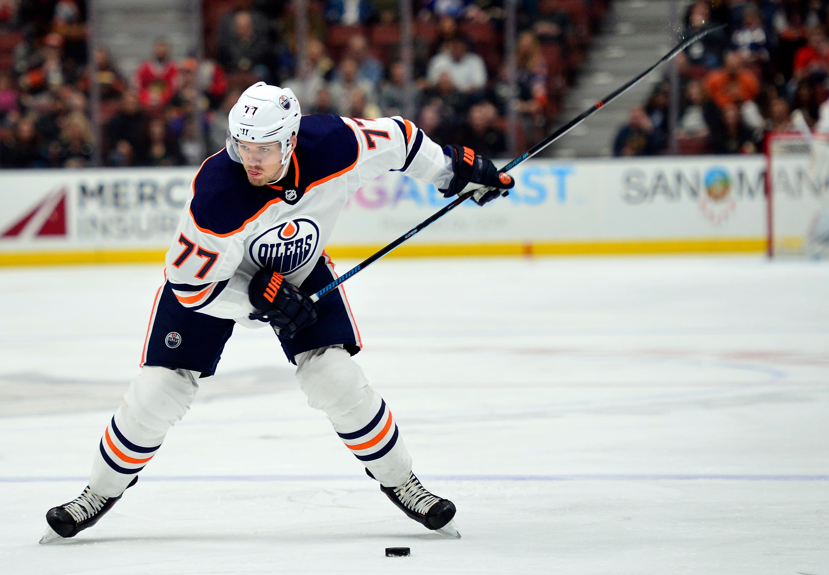 February 9, 2018; Anaheim, CA, USA; Edmonton Oilers defenseman Oscar Klefbom (77) shoots against the Anaheim Ducks during the second period at Honda Center. Mandatory Credit: Gary A. Vasquez-USA TODAY Sports