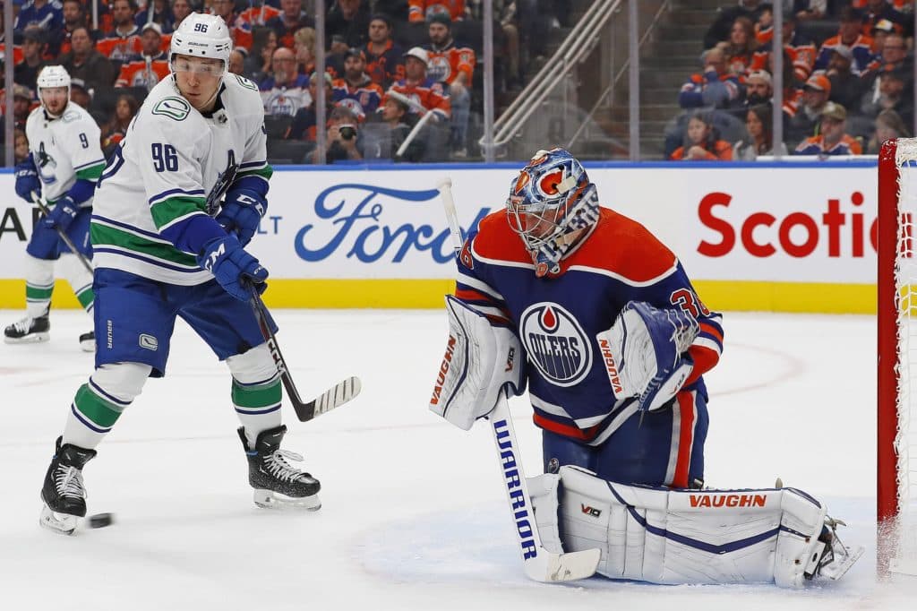 Oct 12, 2022; Edmonton, Alberta, CAN; Vancouver Canucks forward Andrei Kuzmenko (96) tries to deflect a shot past Edmonton Oilers goaltender Jack Campbell (36) during the second period at Rogers Place. Mandatory Credit: Perry Nelson-USA TODAY Sports
