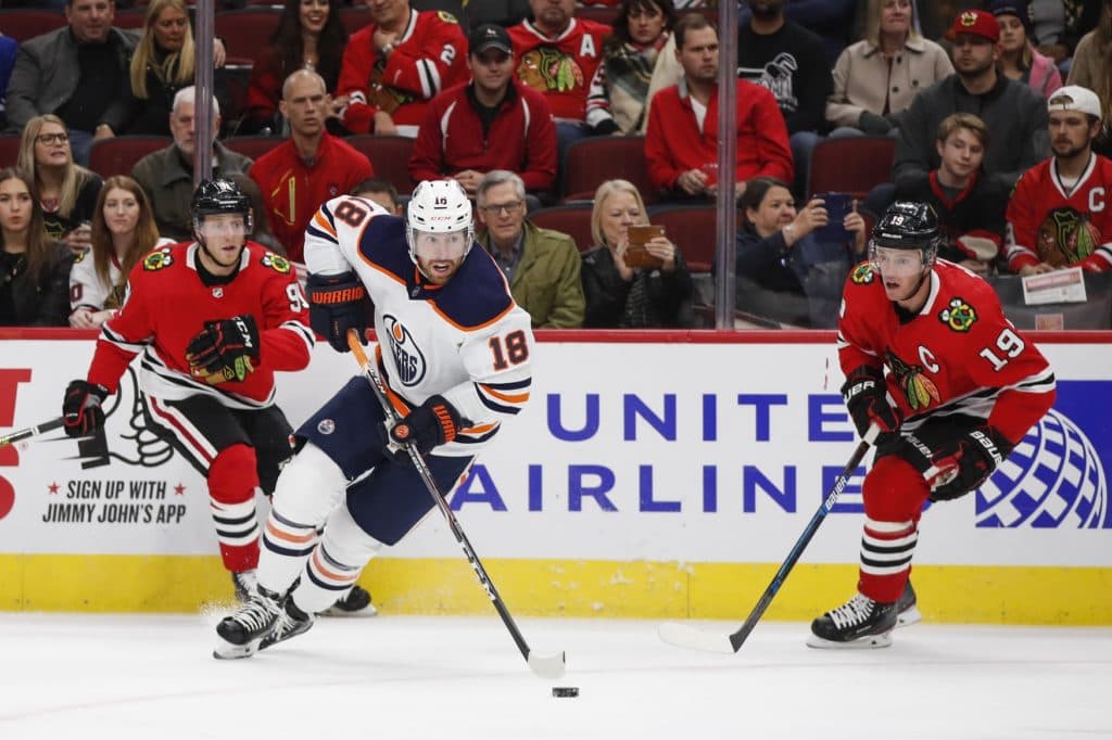 Oct 14, 2019; Chicago, IL, USA; Edmonton Oilers left wing James Neal (18) looks to pass the puck against Chicago Blackhawks center Jonathan Toews (19) during the first period at United Center.