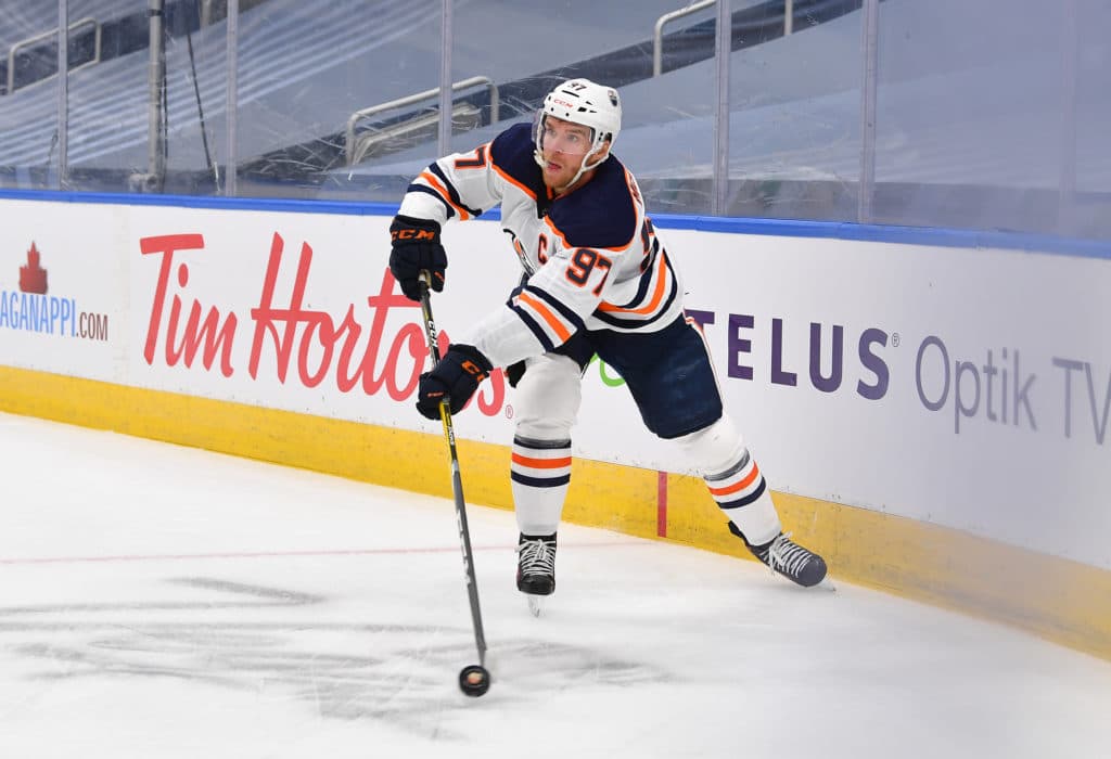 July 28, 2020; Edmonton, Alberta, CANADA; Connor McDavid #97 of the Edmonton Oilers passes the puck from behind the net during the first period of an exhibition game against the Calgary Flames prior to the 2020 NHL Stanley Cup Playoffs at Rogers Place on July 28, 2020 in Edmonton, Alberta. Mandatory Credit: Andy Devlin/NHLI via USA TODAY Sports