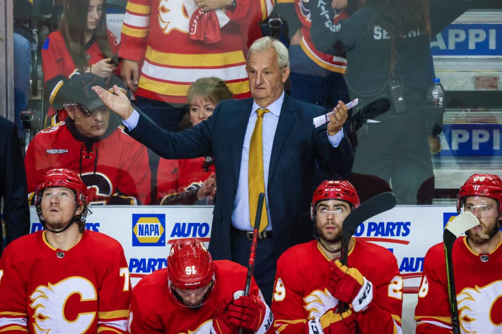 May 26, 2022; Calgary, Alberta, CAN; Calgary Flames head coach Darryl Sutter on his bench against the Edmonton Oilers during the third period in game five of the second round of the 2022 Stanley Cup Playoffs at Scotiabank Saddledome. Mandatory Credit: Sergei Belski-USA TODAY Sports