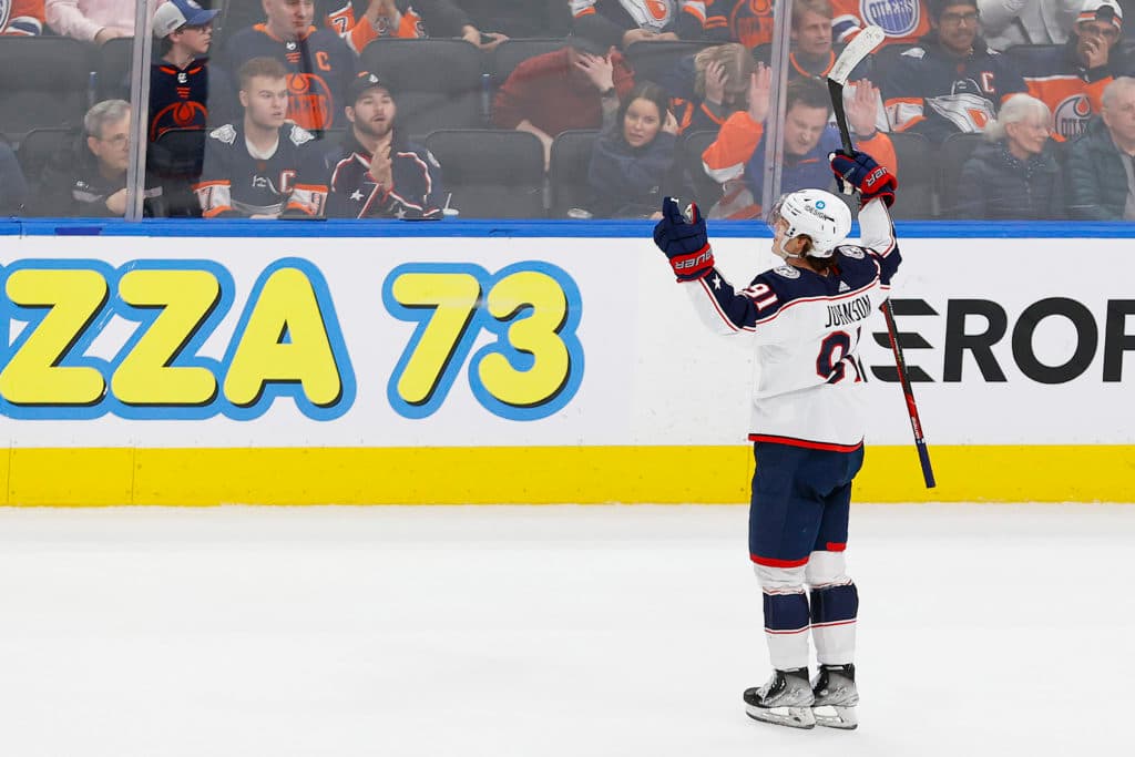 Jan 25, 2023; Edmonton, Alberta, CAN; Columbus Blue Jackets forward Kent Johnson (91) celebrates a goal during overtime against the Edmonton Oilers at Rogers Place. Mandatory Credit: Perry Nelson-USA TODAY Sports