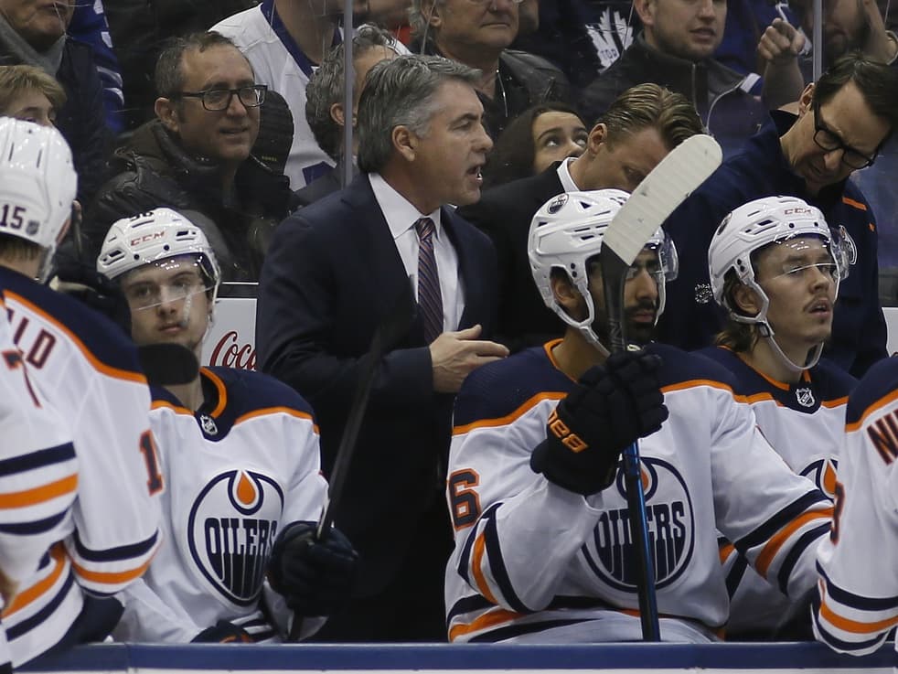 Jan 6, 2020; Toronto, Ontario, CAN; Edmonton Oilers head coach Dave Tippett on the bench during a game against the Toronto Maple Leafs at Scotiabank Arena. Edmonton defeated Toronto. Mandatory Credit: John E. Sokolowski-USA TODAY Sports
