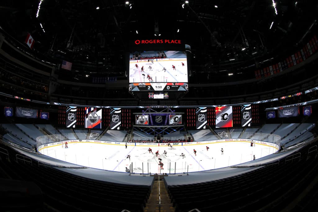July 28, 2020; Edmonton, Alberta, CANADA; A general view of game action during the second period of the exhibition game between the Edmonton Oilers and the Calgary Flames prior to the 2020 NHL Stanley Cup Playoffs at Rogers Place on July 28, 2020 in Edmonton, Alberta. Mandatory Credit: Dave Sandford/NHLI via USA TODAY Sports