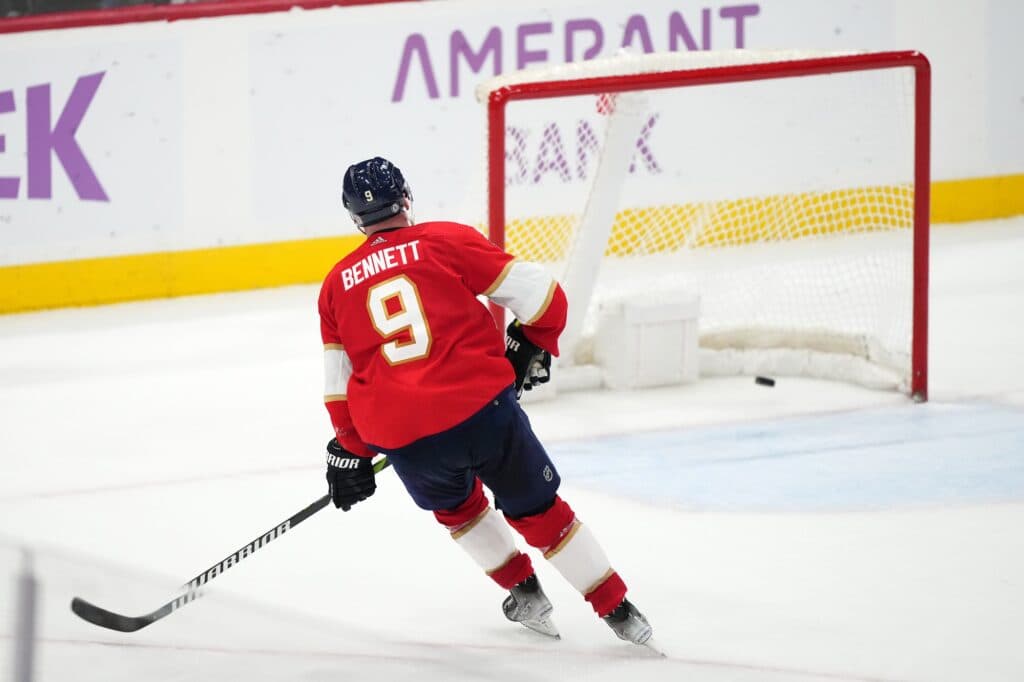 Nov 20, 2023; Sunrise, Florida, USA; Florida Panthers center Sam Bennett (9) scores an empty net goal against the Edmonton Oilers during the third period at Amerant Bank Arena. Mandatory Credit: Jasen Vinlove-USA TODAY Sports