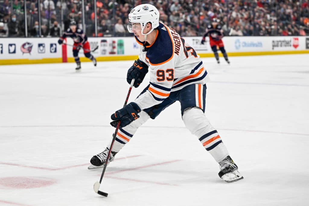 Apr 24, 2022; Columbus, Ohio, USA; Edmonton Oilers center Ryan Nugent-Hopkins (93) in the second period against the Columbus Blue Jackets at Nationwide Arena. Mandatory Credit: Gaelen Morse-USA TODAY Sports