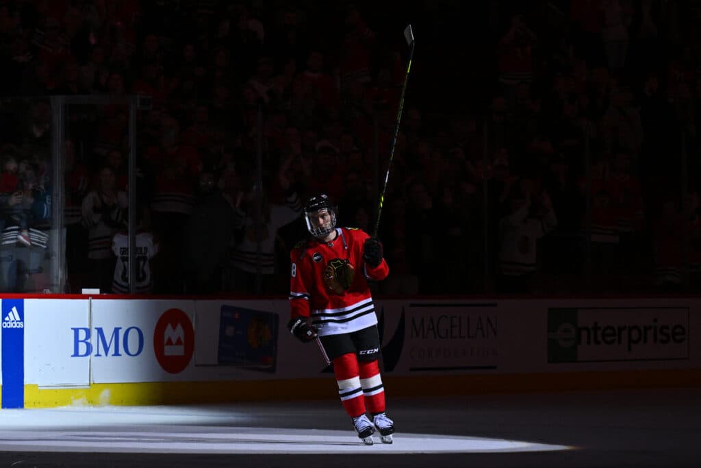Mar 12, 2024; Chicago, Illinois, USA; Chicago Blackhawks forward Connor Bedard (98) salutes the crowd after being name First Star of the game against the Anaheim Ducks at United Center.
