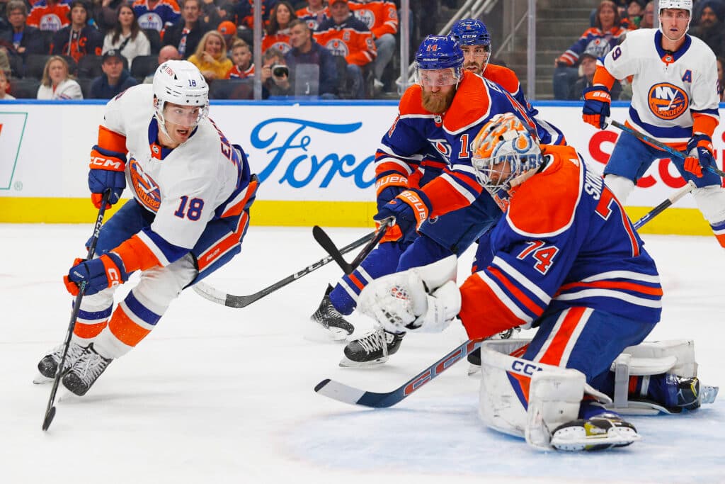 Nov 13, 2023; Edmonton, Alberta, CAN; Edmonton Oilers goaltender Stuart Skinner (74) makes a save on New York Islanders forward Pierre Engvall (18) during the second period at Rogers Place.