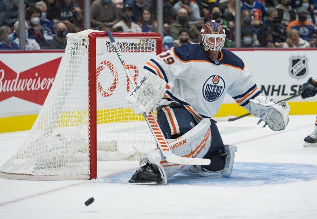 Oct 30, 2021; Vancouver, British Columbia, CAN; Edmonton Oilers goalie Mikko Koskinen (19) makes a save against the Vancouver Canucks in the third period at Rogers Arena. Oilers won 2-1. Mandatory Credit: Bob Frid-USA TODAY Sports