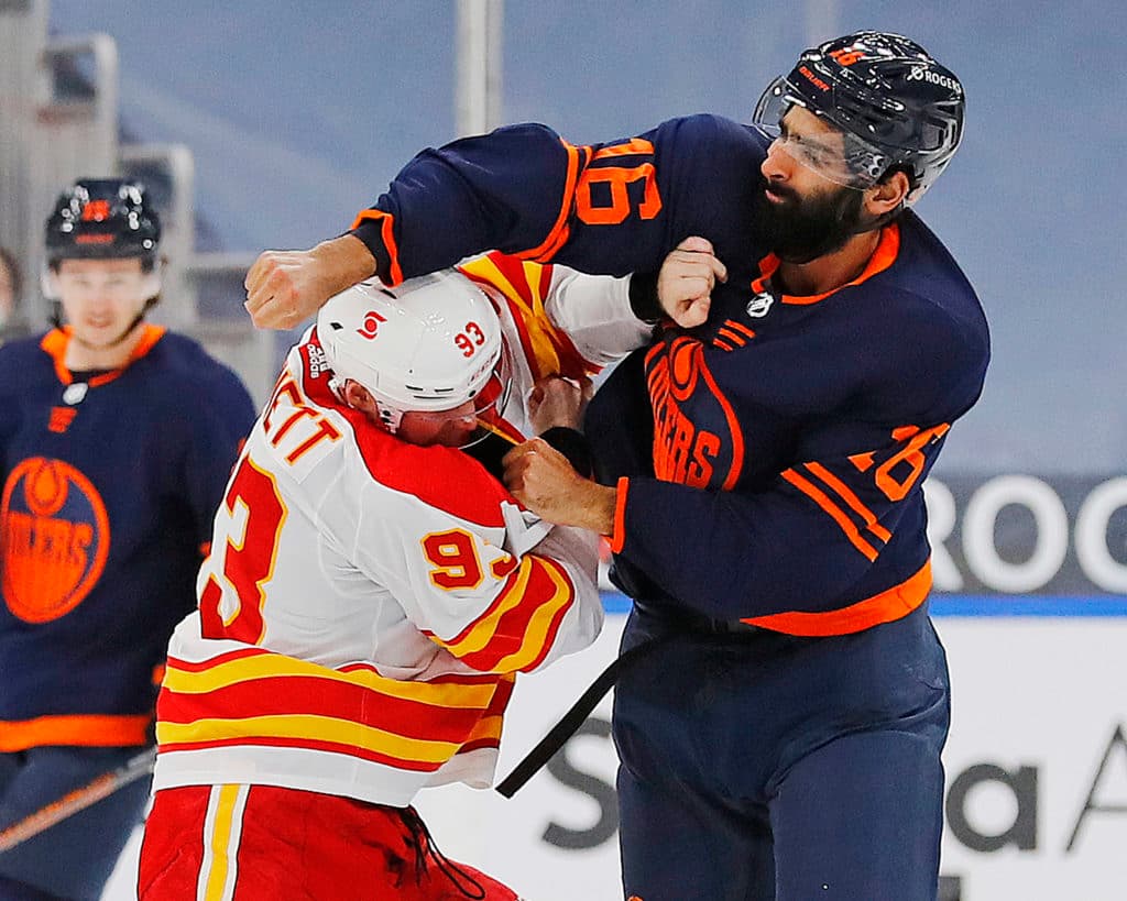 Feb 20, 2021; Edmonton, Alberta, CAN; Edmonton Oilers forward Jujhar Khaira (16) fights Calgary Flames forward Sam Bennett (93) during the first period at Rogers Place.