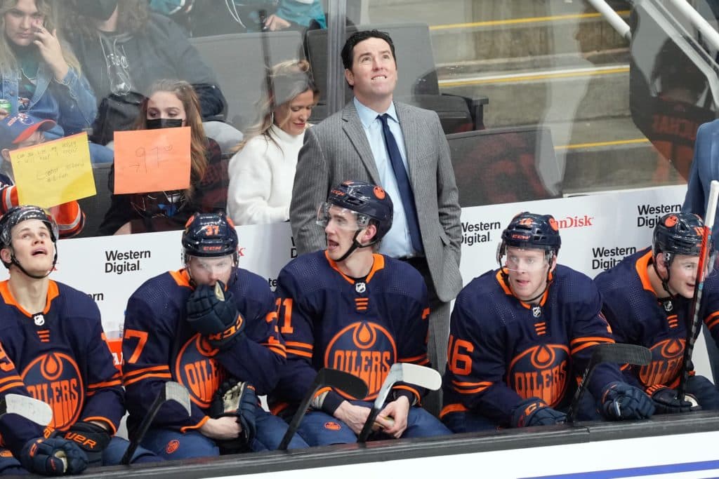 Feb 14, 2022; San Jose, California, USA; Edmonton Oilers head coach Jay Woodcroft stands behind the bench before the third period against the San Jose Sharks at SAP Center at San Jose. Mandatory Credit: Darren Yamashita-USA TODAY Sports