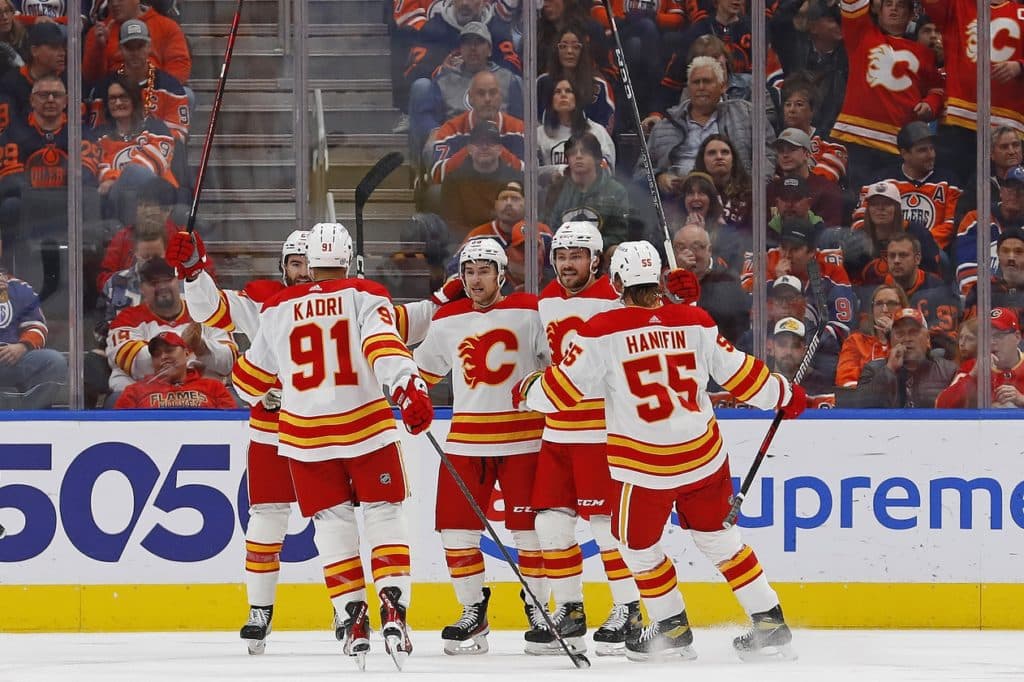 Oct 15, 2022; Edmonton, Alberta, CAN; The Calgary Flames celebrate a goal scored by forward Andrew Mangiapane (88) during the first period against the Edmonton Oilers at Rogers Place. Mandatory Credit: Perry Nelson-USA TODAY Sports