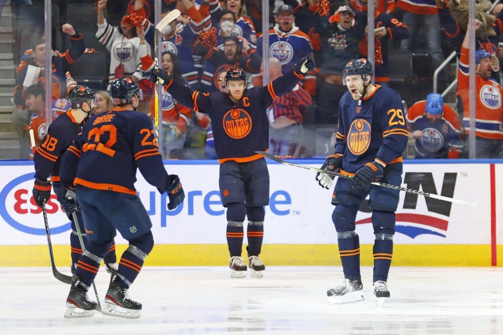 May 4, 2022; Edmonton, Alberta, CAN; The Edmonton Oilers celebrate a goal by forward Leon Draisaitl (29) during the second period against Los Angeles Kings in game two of the first round of the 2022 Stanley Cup Playoffs at Rogers Place. Mandatory Credit: Perry Nelson-USA TODAY Sports