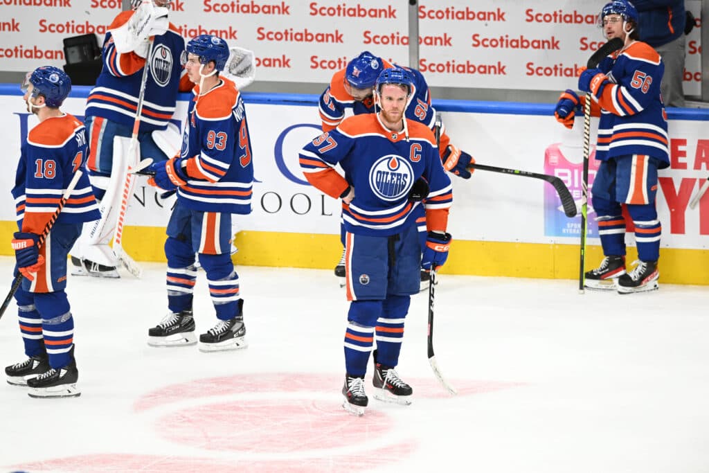 May 14, 2023; Edmonton, Alberta, CAN; Edmonton Oilers center Connor McDavid (97) reacts with teammates after being defeated by the Vegas Golden Knights of the third period in game six of the second round of the 2023 Stanley Cup Playoffs at Rogers Place. Mandatory Credit: Walter Tychnowicz-USA TODAY Sports