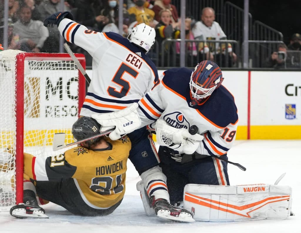 Nov 27, 2021; Las Vegas, Nevada, USA; Edmonton Oilers goaltender Mikko Koskinen (19) tries to control a loose puck as Edmonton Oilers defenseman Cody Ceci (5) and Vegas Golden Knights center Brett Howden (21) battle in the net during the third period at T-Mobile Arena. Mandatory Credit: Stephen R. Sylvanie-USA TODAY Sports