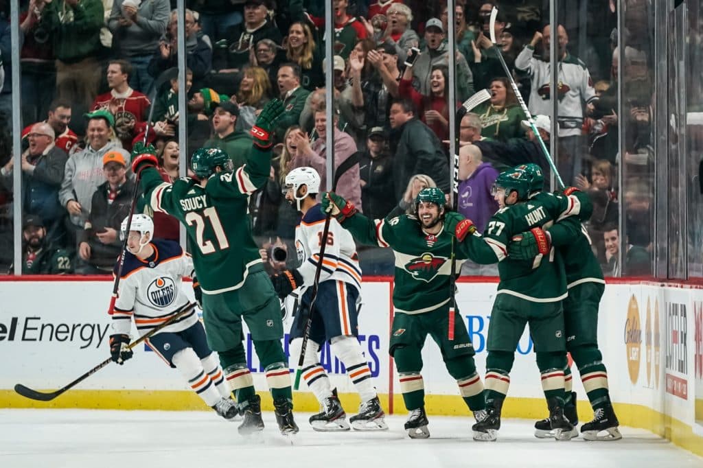 Oct 22, 2019; Saint Paul, MN, USA; Minnesota Wild forward Eric Staal (12) celebrates his goal with defenseman Brad Hunt (77) and teammates during the first period against the Edmonton Oilers at Xcel Energy Center. Mandatory Credit: Brace Hemmelgarn-USA TODAY Sports