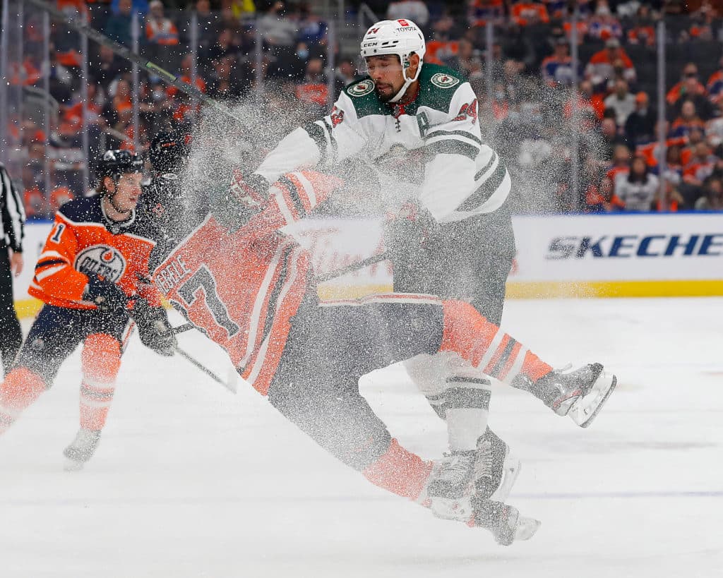 Dec 7, 2021; Edmonton, Alberta, CAN; Minnesota Wild defensemen Matt Dumba (24) checks Edmonton Oilers forward Warren Foegele (37) during the first period at Rogers Place.