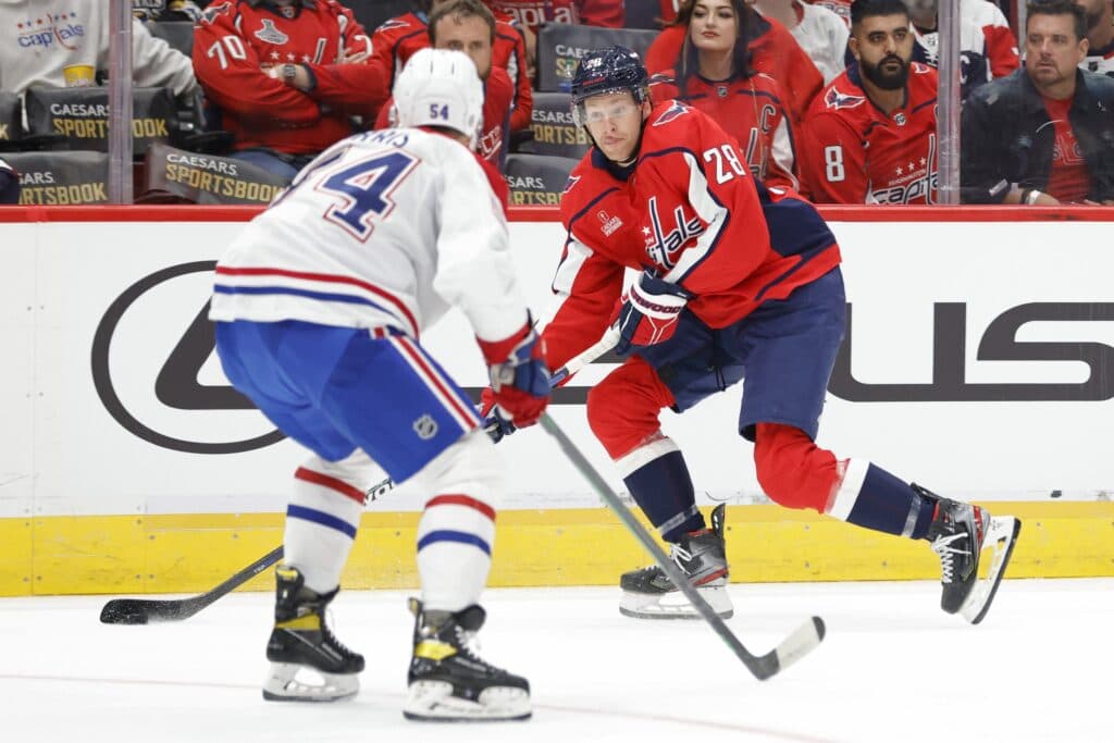 Oct 15, 2022; Washington, District of Columbia, USA; Washington Capitals right wing Connor Brown (28) skates with the puck as Montreal Canadiens defenseman Jordan Harris (54) defends in the first period at Capital One Arena. Mandatory Credit: Geoff Burke-USA TODAY Sports
