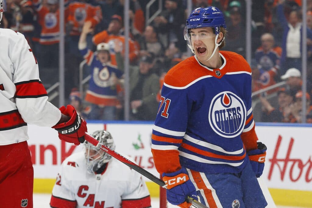 Dec 6, 2023; Edmonton, Alberta, CAN; Edmonton Oilers forward Ryan McLeod (71) celebrates after scoring a goal against the Carolina Hurricanes during the first period at Rogers Place. Mandatory Credit: Perry Nelson-USA TODAY Sports