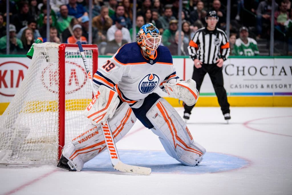 Mar 3, 2020; Dallas, Texas, USA; Edmonton Oilers goaltender Mikko Koskinen (19) in action during the game between the Stars and the Oilers at the American Airlines Center. Mandatory Credit: Jerome Miron-USA TODAY Sports