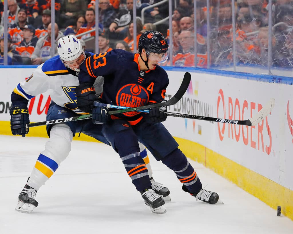 Jan 31, 2020; Edmonton, Alberta, CAN; Edmonton Oilers forward Ryan Nugent-Hopkins (93) and St. Louis Blues forward Sammy Blais (9) battle along the boards for a loose puck during the third period at Rogers Place. Mandatory Credit: Perry Nelson-USA TODAY Sports