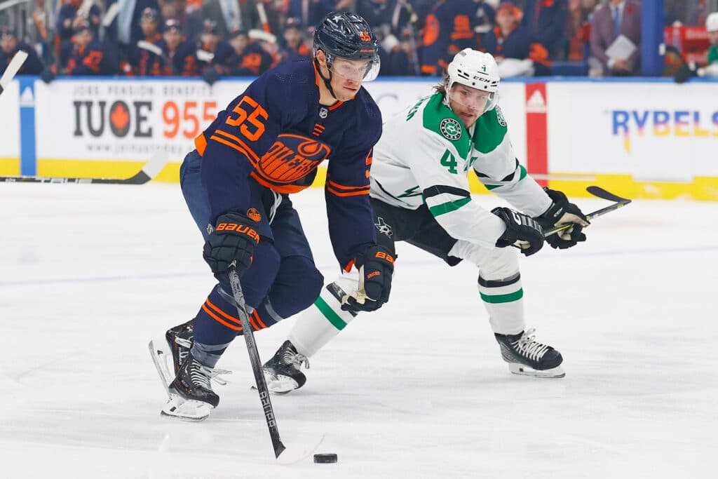 Nov 2, 2023; Edmonton, Alberta, CAN; Edmonton Oilers forward Dylan Holloway (55) tries to carry the puck around Dallas Stars defensemen Miro Heiskanen (4) during the first period at Rogers Place. Mandatory Credit: Perry Nelson-USA TODAY Sports