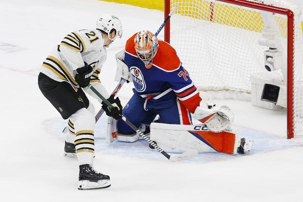 Feb 21, 2024; Edmonton, Alberta, CAN; Edmonton Oilers goaltender Stuart Skinner (74) makes a save on on Boston Bruins forward James van Riemsdyk (21) during overtime at Rogers Place. Mandatory Credit: Perry Nelson-USA TODAY Sports