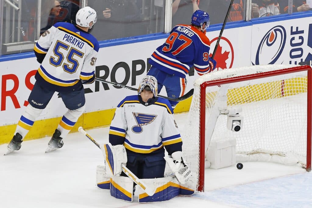 Feb 28, 2024; Edmonton, Alberta, CAN; Edmonton Oilers forward Connor McDavid (97) scores the game wining goal during overtime against St. Louis Blues goaltender Jordan Binnington (50) at Rogers Place. Mandatory Credit: Perry Nelson-USA TODAY Sports