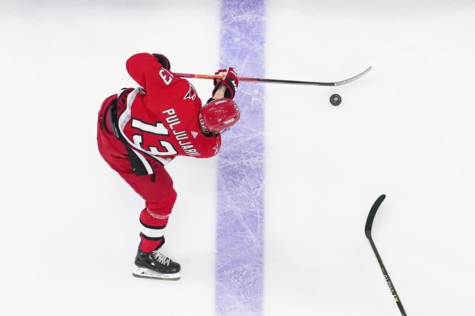 Apr 11, 2023; Raleigh, North Carolina, USA; Carolina Hurricanes right wing Jesse Puljujarvi (13) skates with the puck against the Detroit Red Wings during the second period at PNC Arena. Mandatory Credit: James Guillory-USA TODAY Sports