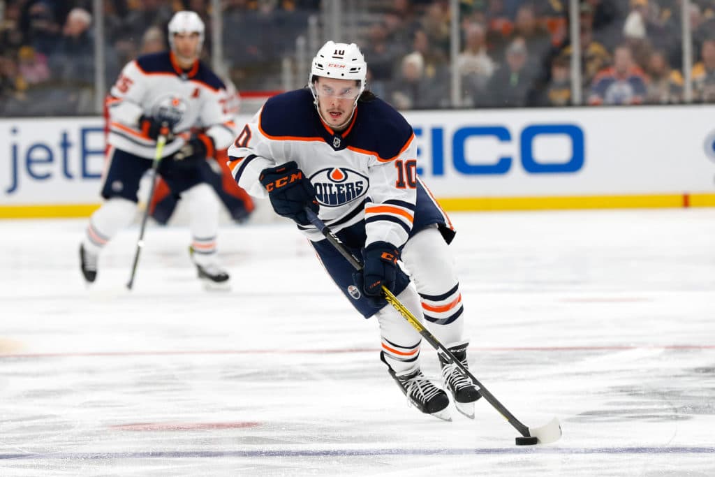 Jan 4, 2020; Boston, Massachusetts, USA; Edmonton Oilers left wing Joakim Nygard (10) during the second period against the Boston Bruins at TD Garden. Mandatory Credit: Winslow Townson-USA TODAY Sports